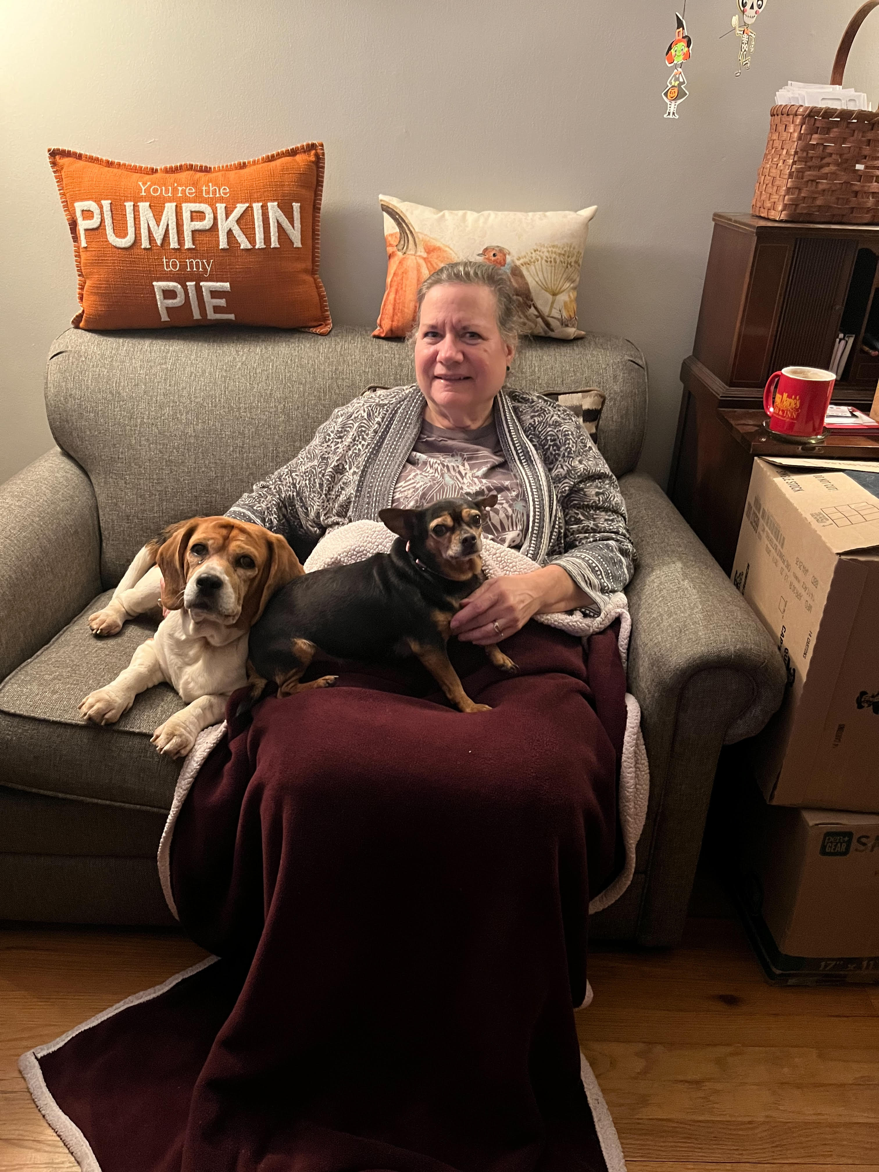Yesterday my 5-minute drive to my morning occupation was met with a cold fog.  I craved a hot cocoa and anticipated fixing a mug of frothy warmth and comfort when I got into work. No hot cocoa mix in stock at work and its now placed on the order list for next week. All day I was craving that chocolatey comfort which only hot cocoa can provide. After a long, busy week, Friday evening I finally sat down on my living room couch and indulged in a cup of warm cocoa. My daughter’s two dogs, Beatrice and Grimmy joined me for some cuddle time while I cradled the hot mug in my cold hands and my favorite blankie hugged my legs. This is comfort at its best. I am thankful to be given this comfort I craved. Let me not take this privilege for granted.